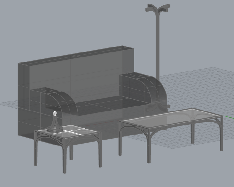 I started the creative process with some sketching of concepts and the basic look I wanted the furniture to have. All of the pieces share a common theme of arched corners and sleek metal structures. Some pieces, like the standing lamp, didn't work with this design, so they were eventually scrapped. The layout of the final render was pretty much set at this stage and I knew what I wanted to make, so I started to create rough versions of all of the objects in Rhino.